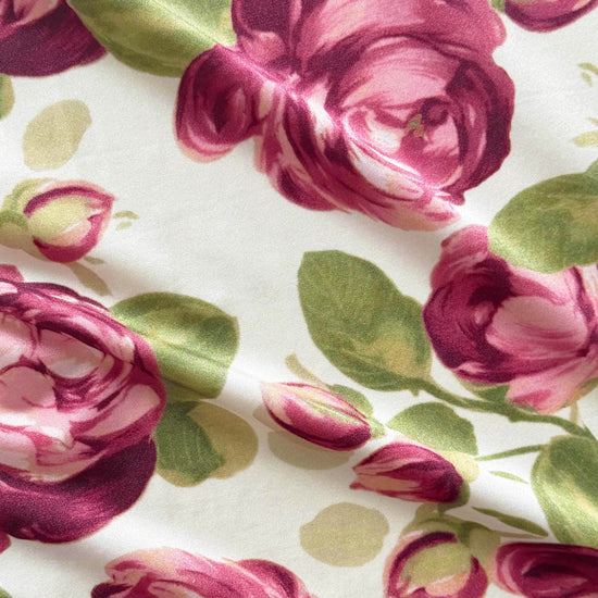 Exclusive in—house created Plum Rose textile print