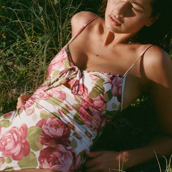 Adjustable straps for a versatile fit Functioning front ties for desired coverage Statement cut out detail Multiple sizing options at back closure Soft removable paddingPremium golden hardware Exclusive in—house created Plum Rose textile print True to size. Go for your regular size. Model wears a size S. Her bust is 77cm, her waist is 60cm and her lower hip is 89cm