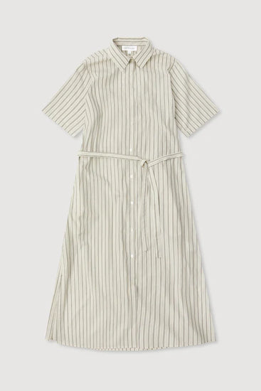 The Ria Stripe Midi Shirt Dress in Cream/Smoke is a 100% cotton midi dress with a shirt collar, button front, side seam pockets, and a waist tie belt.