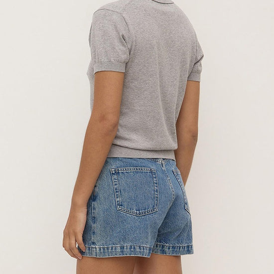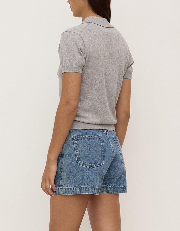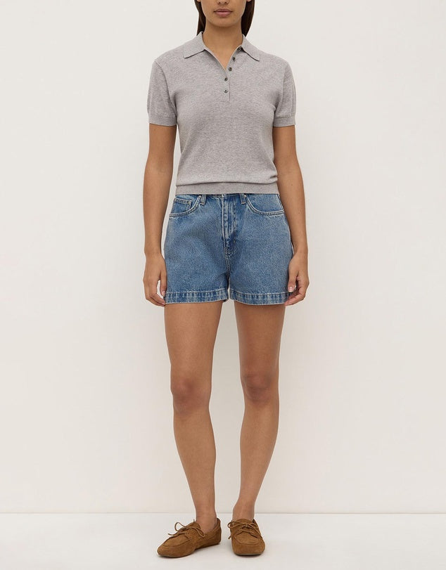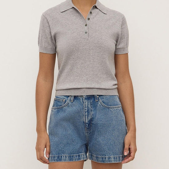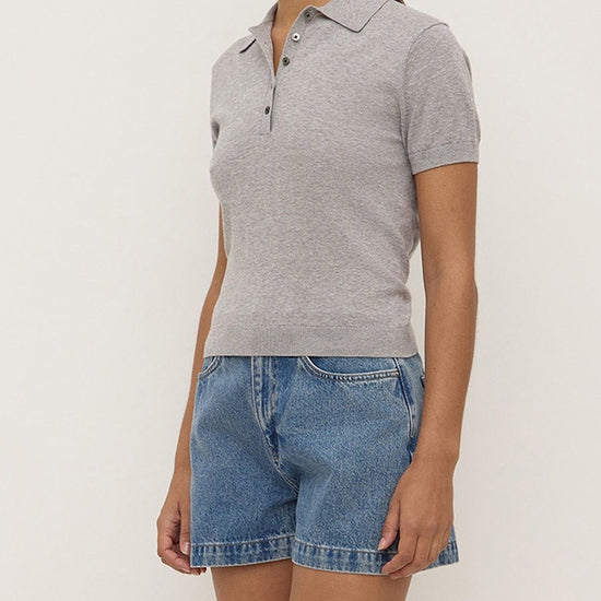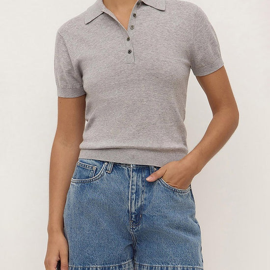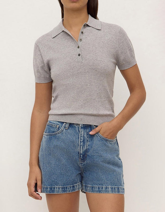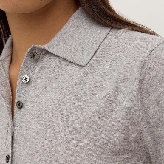 The Sloane Cotton Cashmere Polo in Grey Marle is a slim polo knit made from a cotton-cashmere blend with ribbed sleeve and hem detailing.