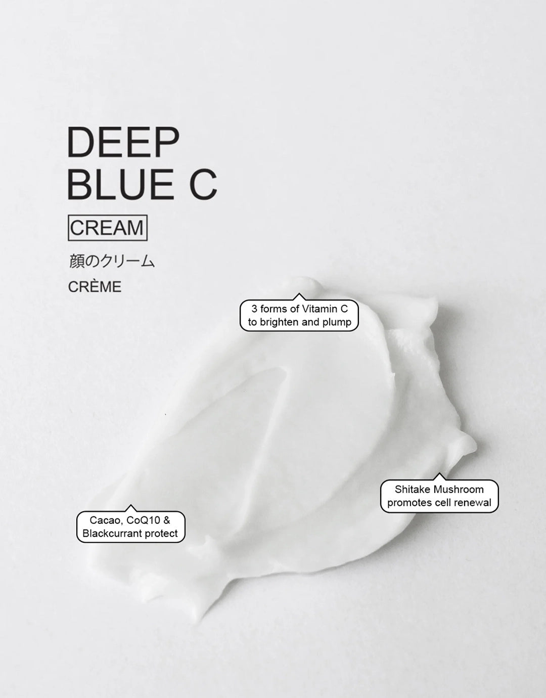 Aqua, Ethyl Ascorbic Acid, Butyrospermum Parkii (Shea) Butter, Glycerin, Camellia Oleifera (Camellia) Seed Oil, Glyceryl Strearate Citrate, Hydroxyethyl Acrylate/Sodium Acryloyldimethyl Taurate Copolymer, Glyceryl Caprylate, Oryza Sativa (Rice) Bran Wax, Tocopherol, Xanthan Gum, Acacia Gum, p-anisic Acid, Theobroma Cacao Seed Extract, Sodium Phytate, L-ascorbic acid, Sodium Ascorbyl Phosphate, Mangifera Indica (Mango) Seed Butter, Ascorbyl Tetraisopalmitate, Lentinus Edodes (Shitake Mushroom) Extract, Ribes Nigrum (Blackcurrant) Extract, Davidsonia Jerseyana (Davidson Plum) Fruit Extract, Coenzyme Q10, Anigozanthos Flavidus (Kangaroo Paw) Flower Extract, Chondrus Crispus (Sea Moss)