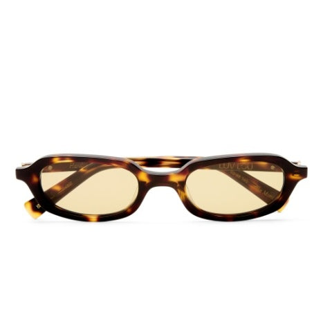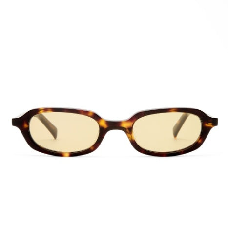 -Finished in a premium crystal tort frame with mustard tint lenses.
