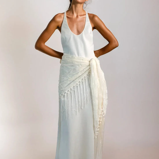 A refined statement piece designed for effortless versatility. The Manon Midi Scarf Dress pairs a minimalist halter silhouette with its own matching devoré scarf, crafted to drape across the shoulders or cinch softly at the waist.