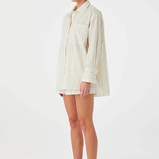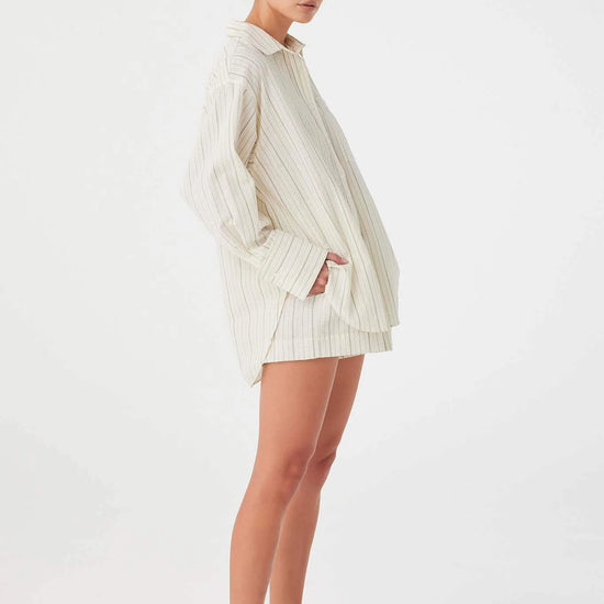 The Rae Boxer Short in Olive Stripe is a relaxed warm-weather staple crafted from 100% cotton with a textured stripe weave. Designed with an elasticated waistband, two-button fly detail, and a lightweight breathable finish, it offers comfort and ease for everyday wear or layered sets.