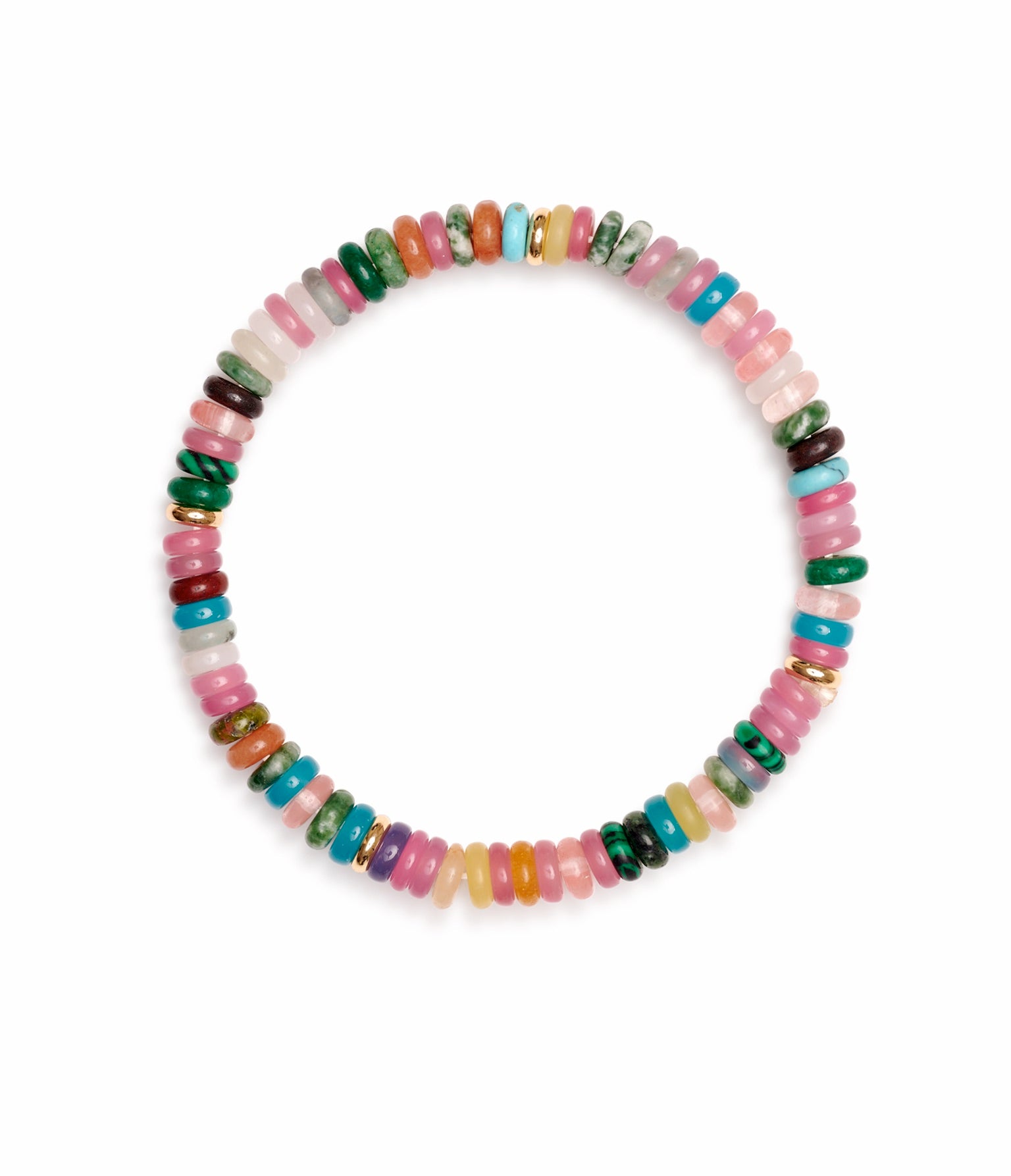 Semi precious donut beads scattered with 18k gold plated rondelles strung on a chain with clasp.